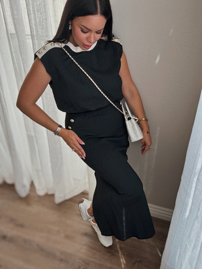 Falda midi con diseño de textura tipo cable knit. Tela no es caliente. Elástico en la cintura para un ajuste cómodo, y detalles de botones dorados perlados a ambos lados. Apertura trasera para mayor movilidad.