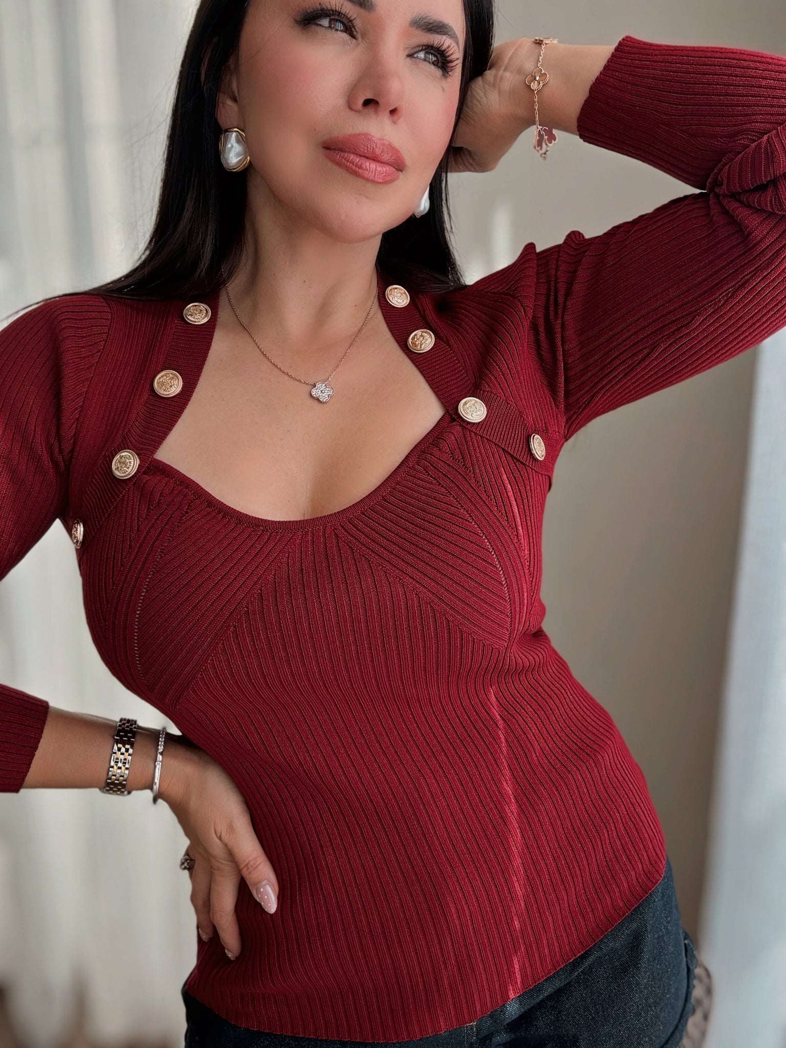 Su diseño estructurado realza la silueta con elegancia y firmeza, mientras que los botones dorados enmarcan el escote con un toque sofisticado que roba miradas.