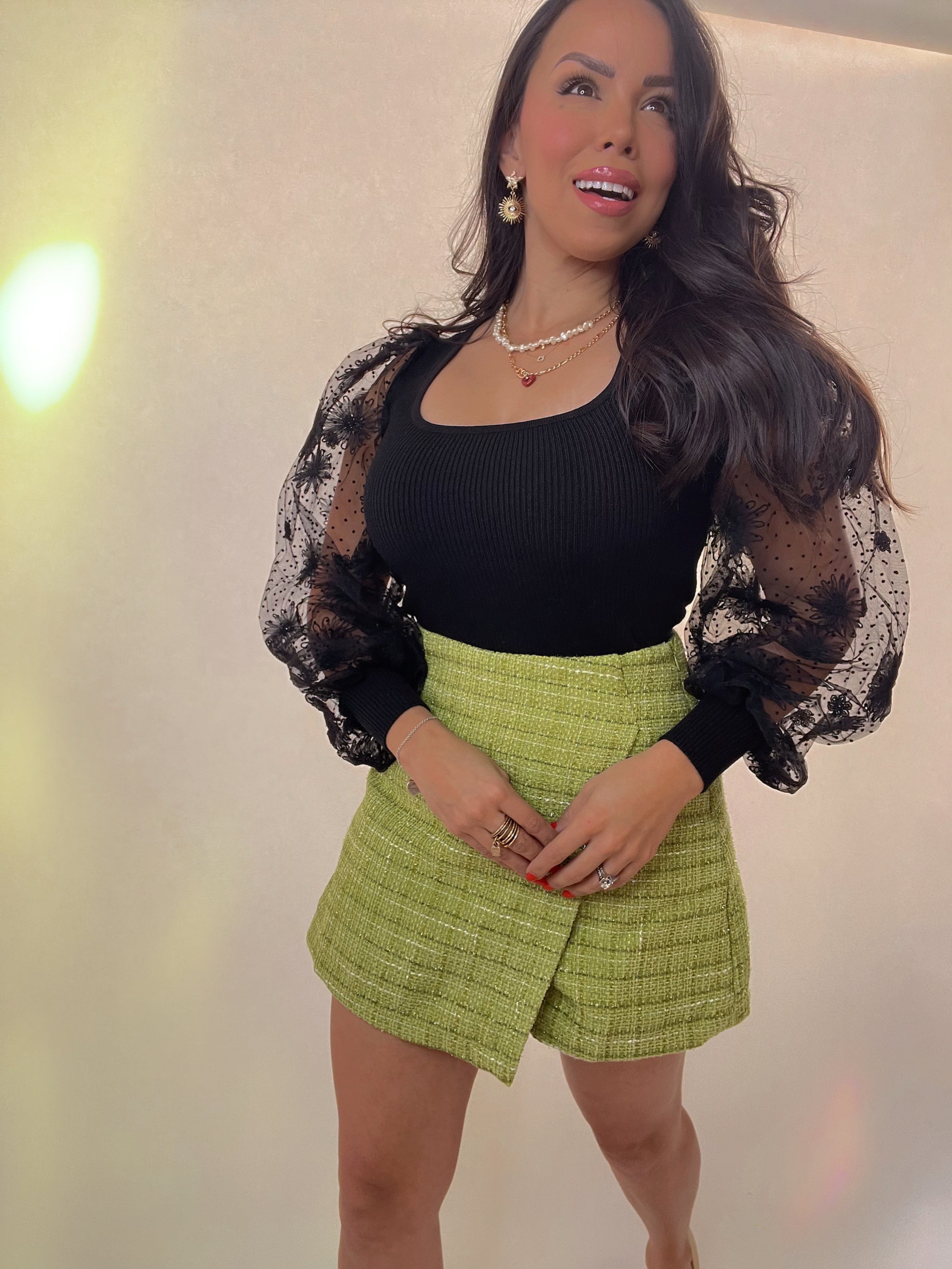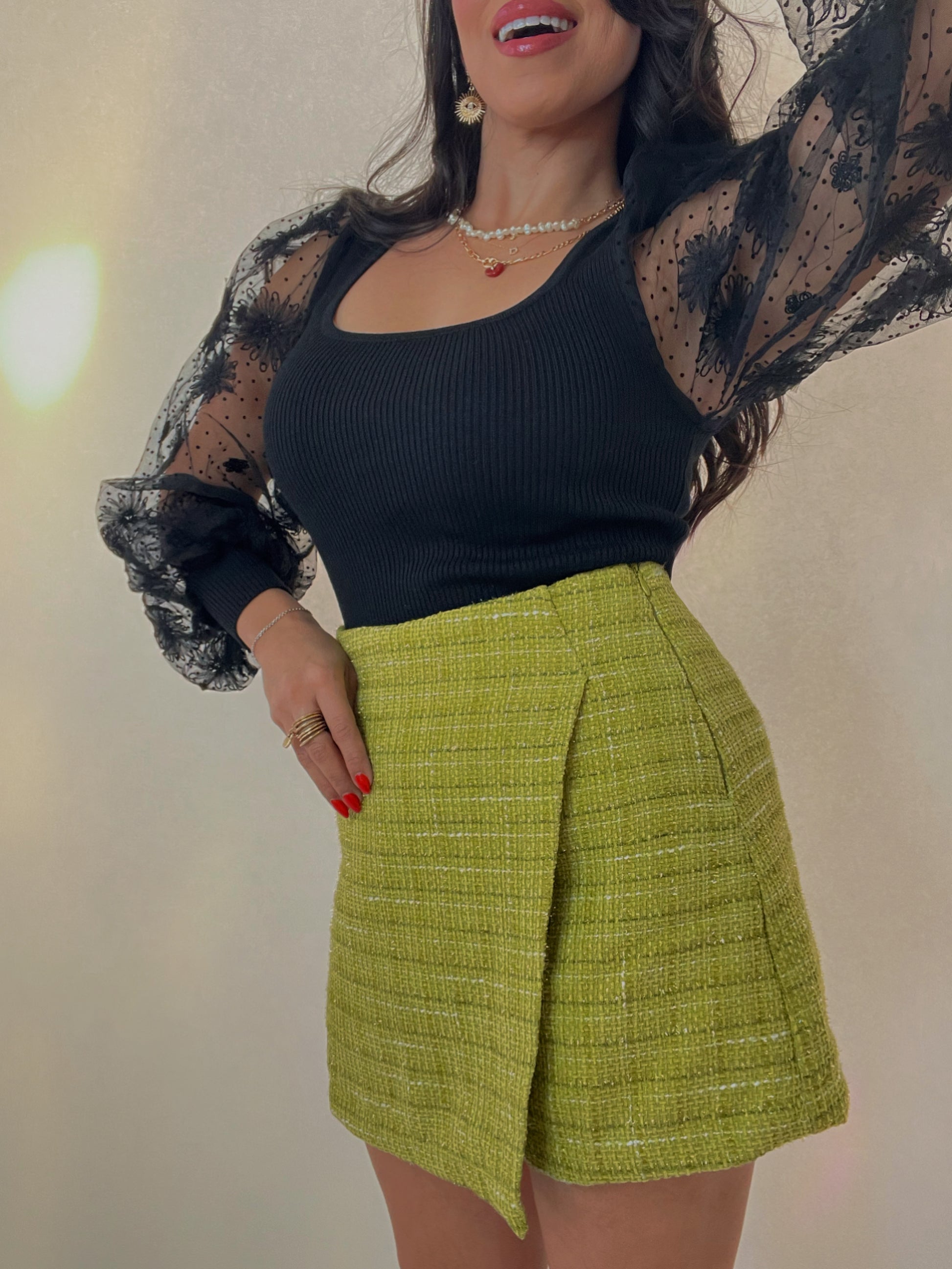 Skort cierra con zipper al lado. Tela tweed delgada y comoda, tiene forro, No pica. Corre al size