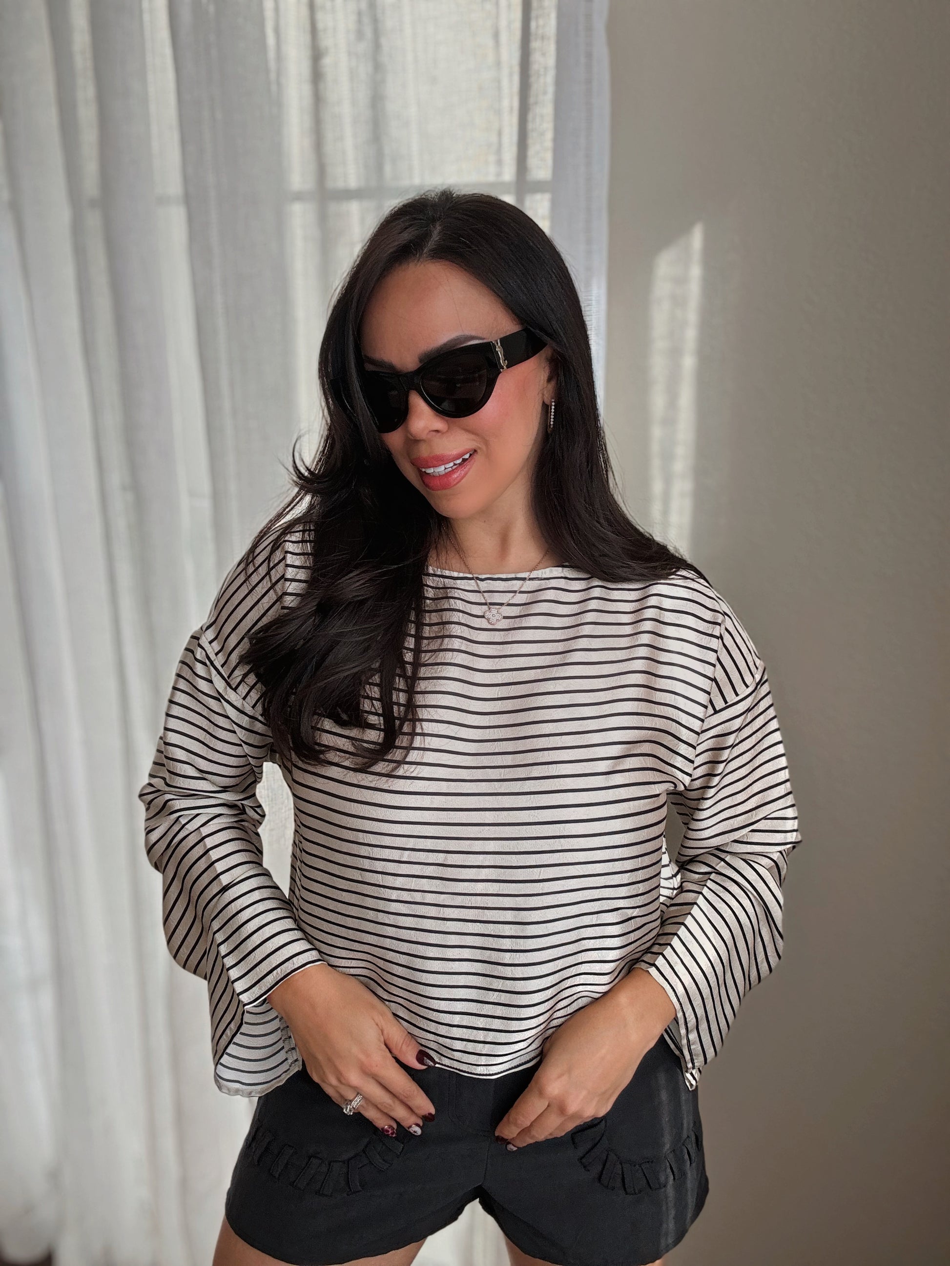 Las lineas son tendencia y este top te hará resaltar dic o noche. Tono champagne con lista en color negro.