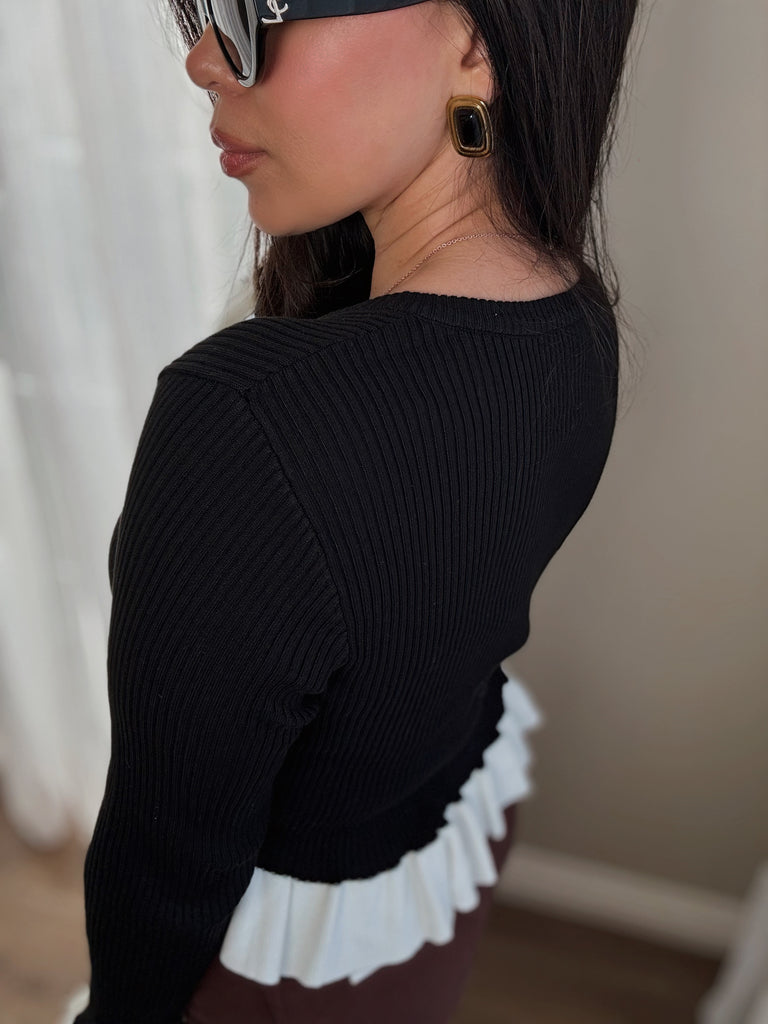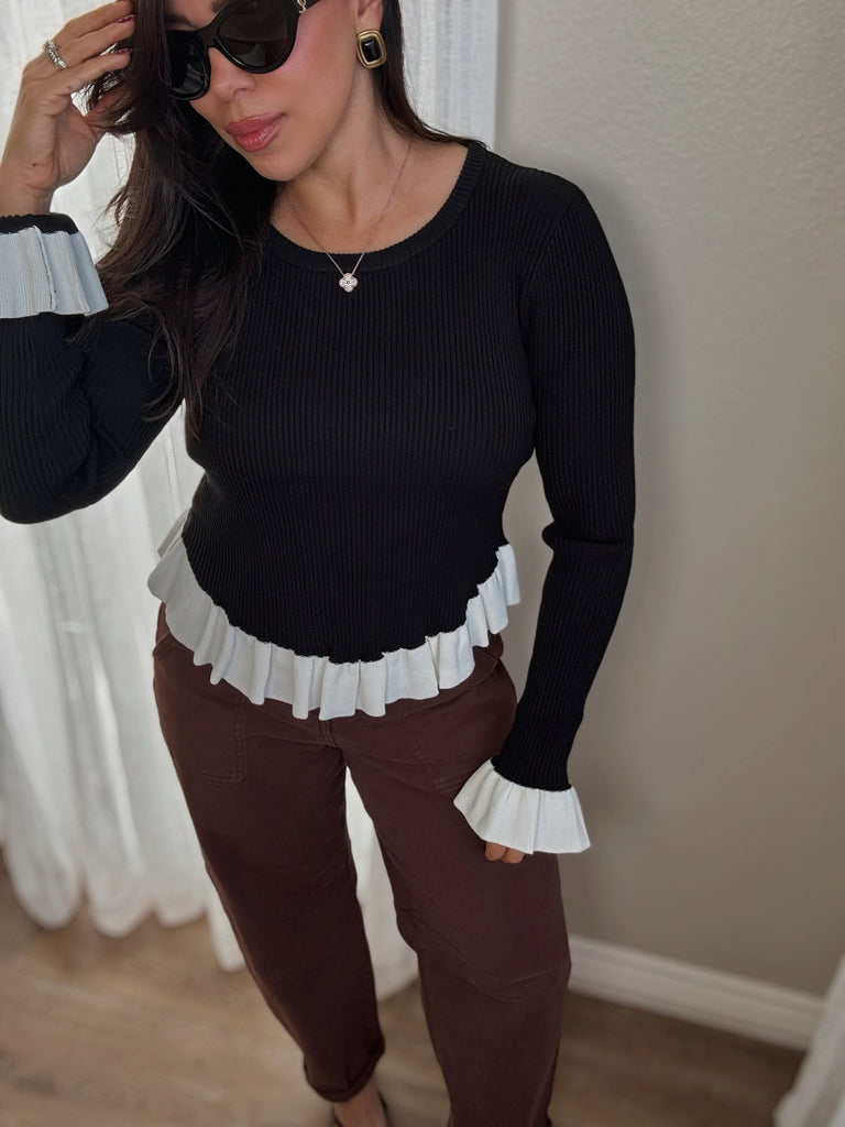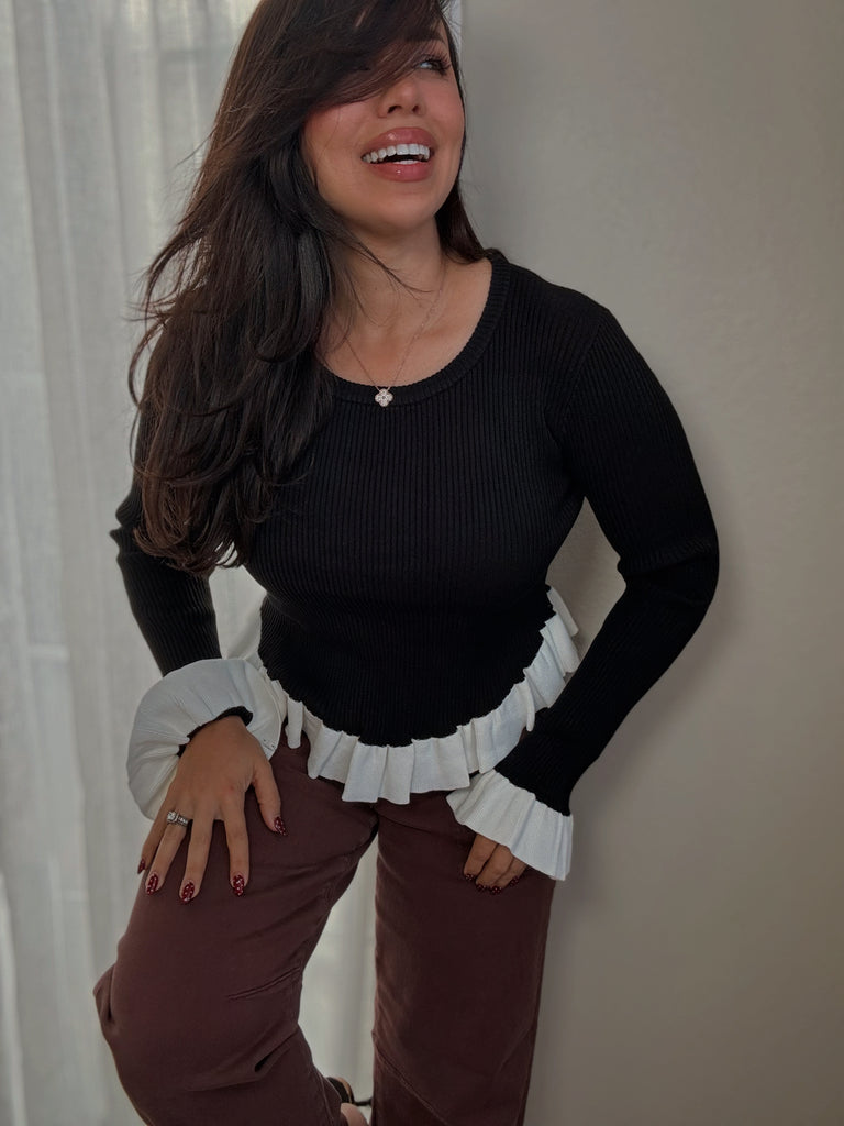 El tejido (ribbed) se adapta suavemente a la silueta, ofreciendo comodidad y un fit favorecedor. Su diseño de manga larga con acabado en volante blanco aporta un contraste chic y femenino, perfecto para destacar en outfits casuales o más elegantes.