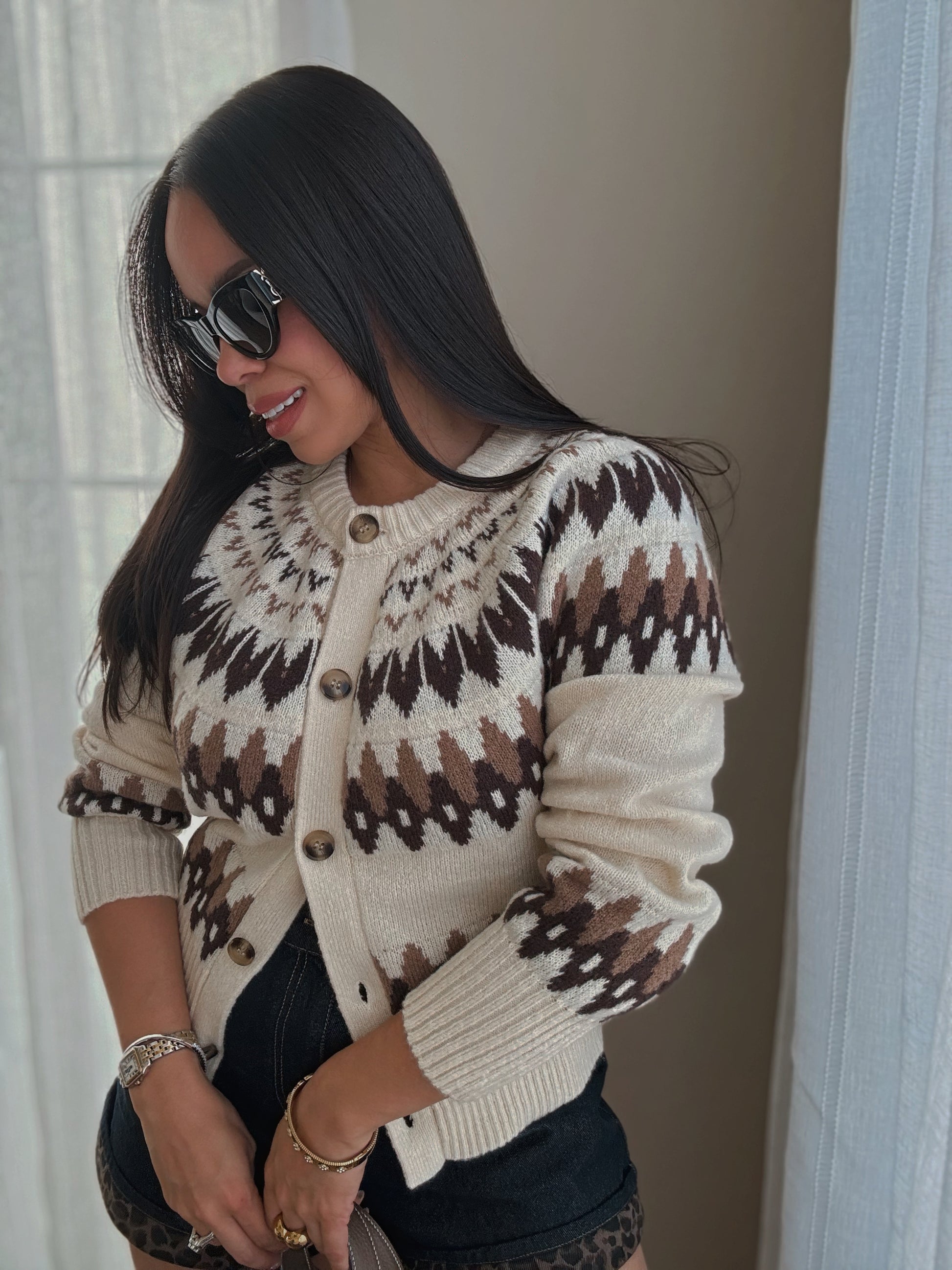 Este cardigan Fair Isle de silueta clásica y tejido suave es el complemento perfecto para darle un toque nostálgico y moderno a tu look. Su estampado geométrico en tonos neutros evoca las tradiciones del otoño con un giro cool que se adapta a estilos casuales o elevadamente relajados.