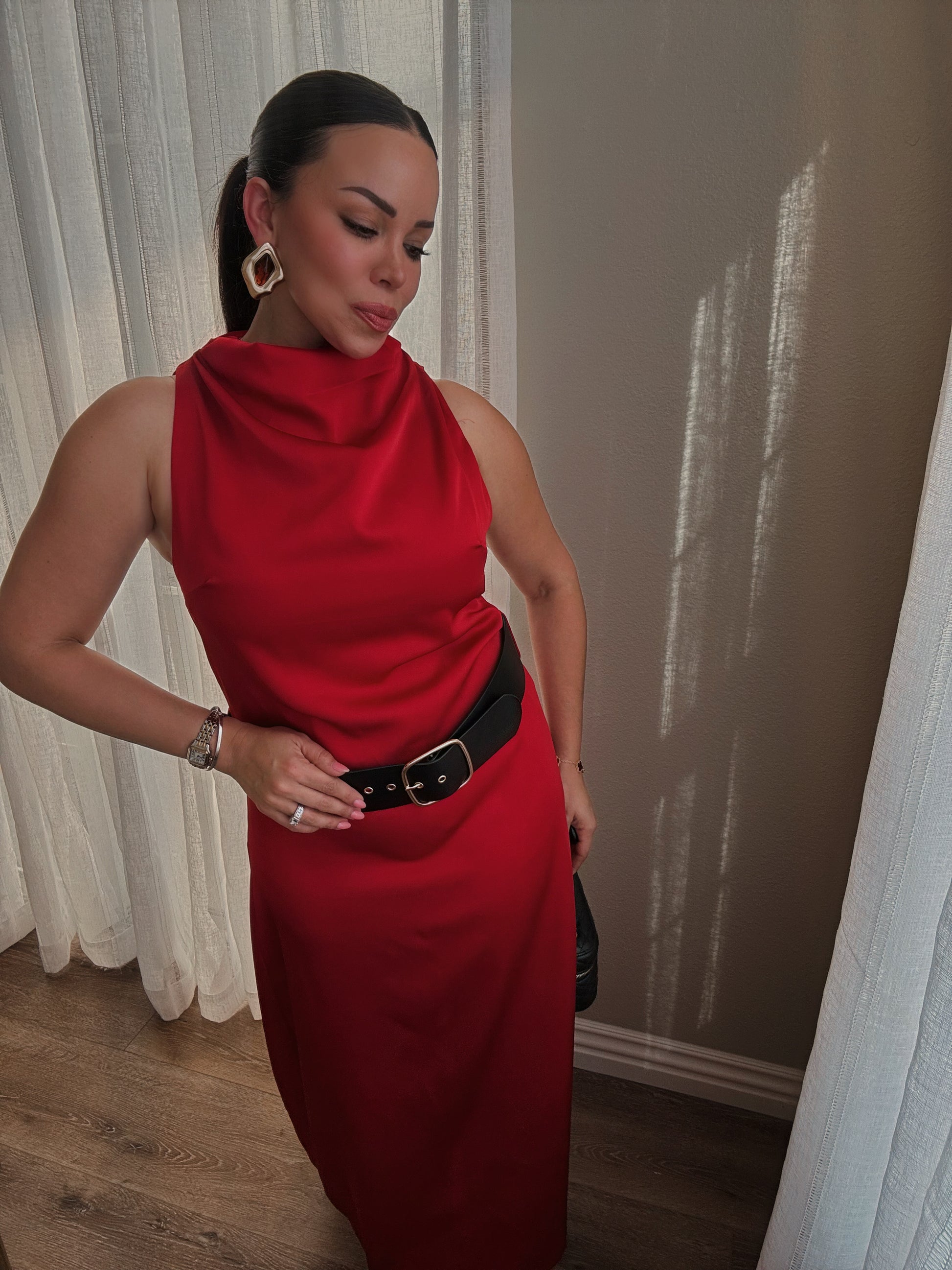 Vestido rojo de silueta elegante y atemporal, diseñado para destacar con sencillez y sofisticación. Su caída fluida estiliza la figura, mientras el cuello drapeado añade un toque moderno y femenino. Incluye correa negra removible que define la cintura y eleva el look.