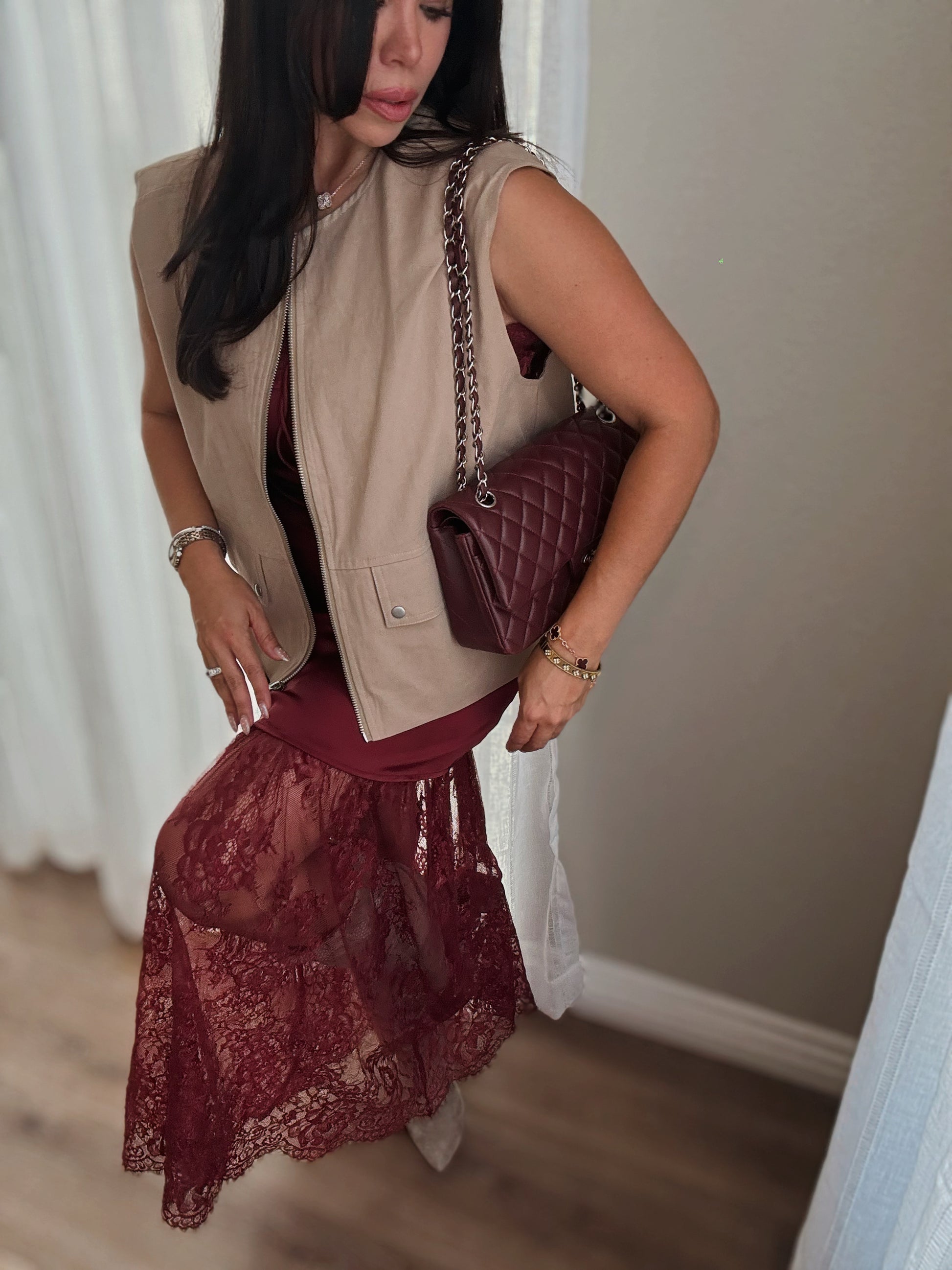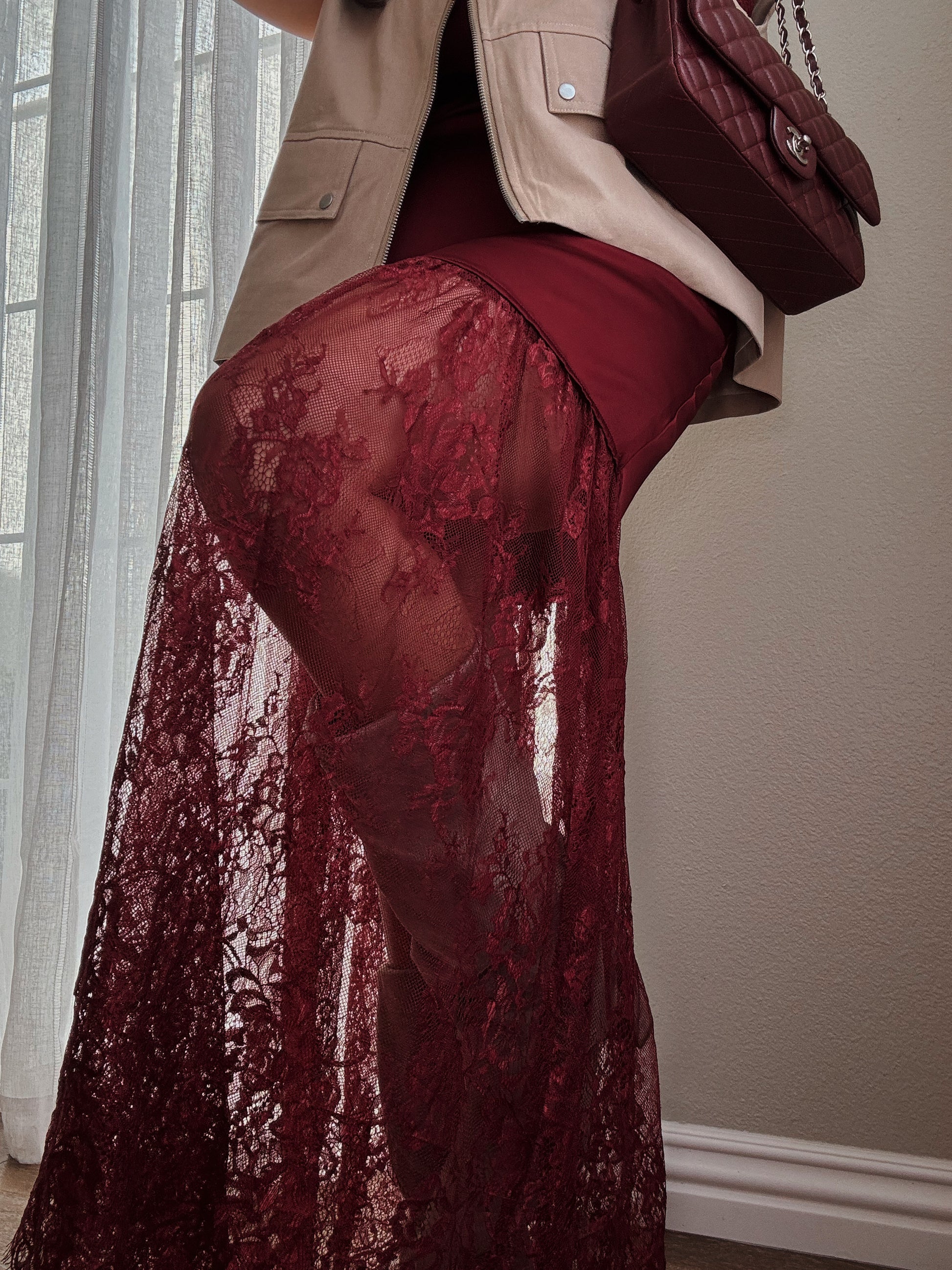 Este vestido largo tipo slip en satén burdeos es una pieza que equilibra lo sensual con lo elegante. El delicado encaje en el escote añade un toque femenino, mientras que la falda con superposición de encaje floral transparente brinda contraste y movimiento con cada paso. Su confección en tela satinada fluida estiliza la figura y aporta ese toque de lujo sin esfuerzo.